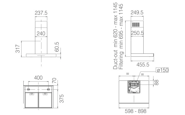 • 1 - Филтърът с активен въглен неутрализира миризми и е необходим в случаите на монтаж в режим на абсорбатор - без тръби, тогава когато абсорбатора връща пречистен въздух в същото помещение.