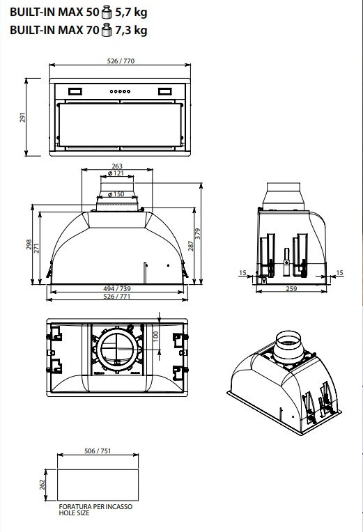 Аспиратор FALMEC BUILT IN MAX 50 BK, метален филтър за мазнини, LED осветление, монтажни елементи и ръководство за употреба. Аксесоари: въздуховоди, обратна клапа (THERMOBOX), елементи COMPAIR PRIME flow® и др.