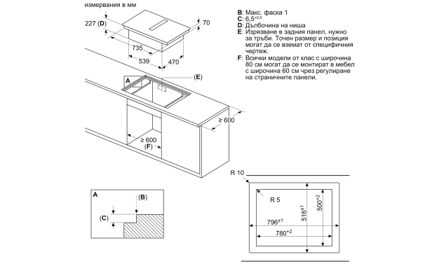 - – Не е необходим фалшив под под готварския плот с интегрирана вентилационна система Downdraft. Чекмеджетата и/или рафтовете в подовия модул трябва да са подвижни. Задният панел на подовия модул може да се запази – необходим е само изрез за изхода за въздух (позицията и размерът могат да се вземат от инструкциите за монтаж).