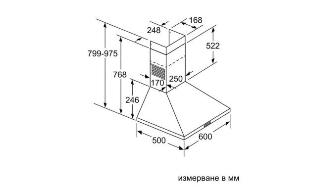 Размери на уреда при отвеждане на въздуха (ВxШxД): 799-975 x 600 x 500 mm