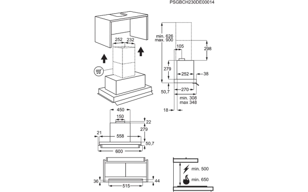 Минимално разстояние над плот 50 см (ел.), 65 см (газ)
