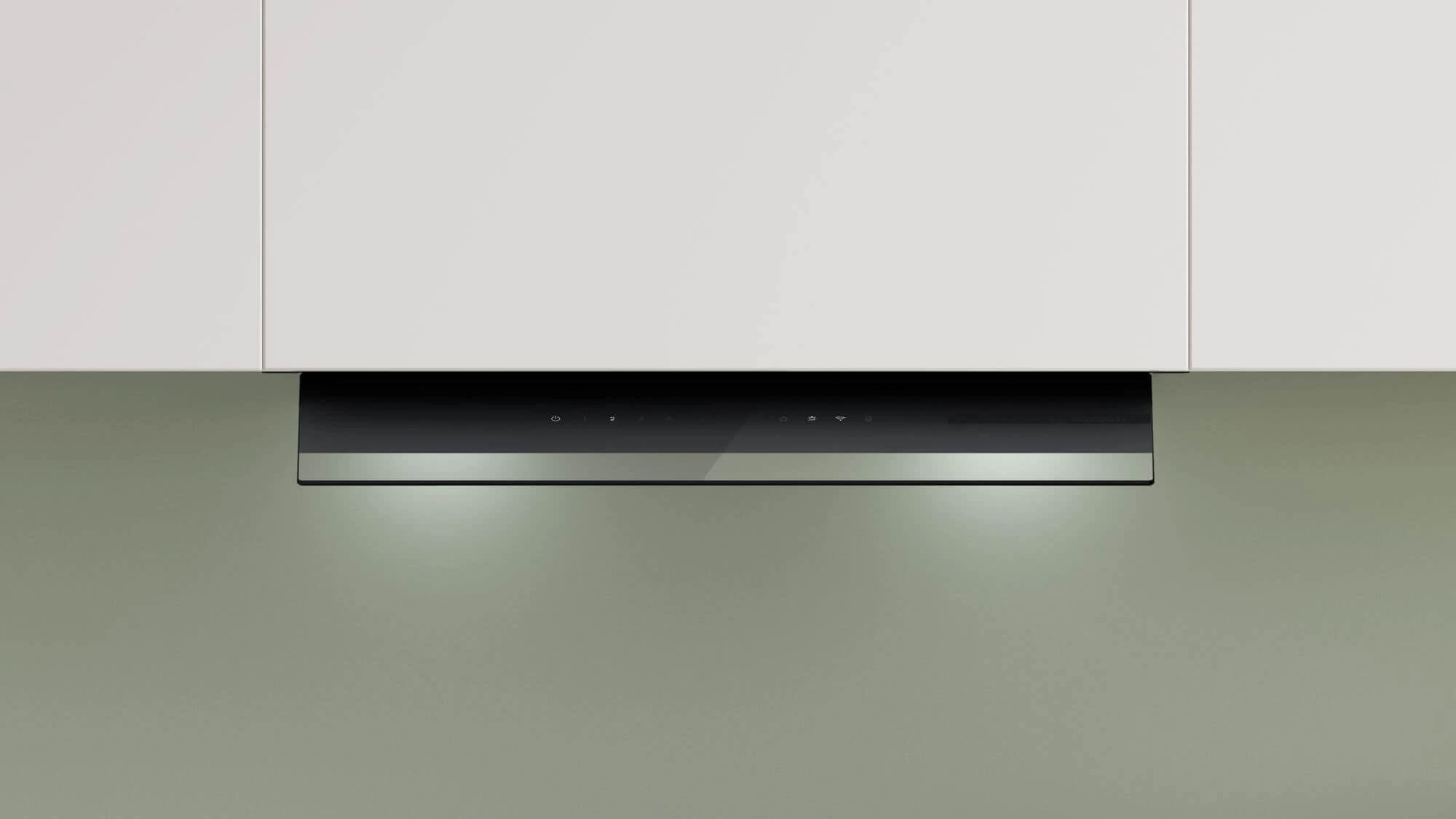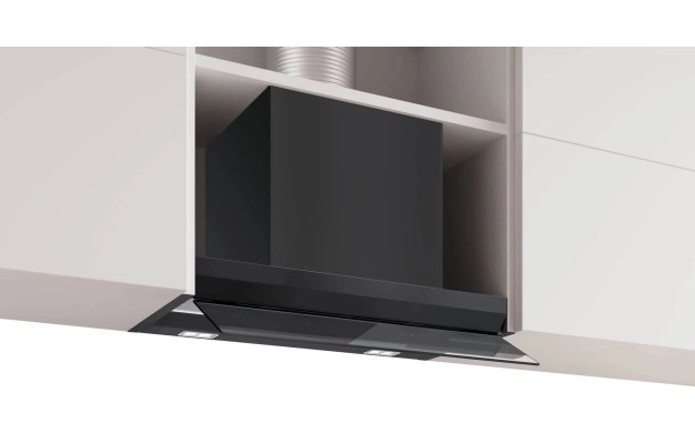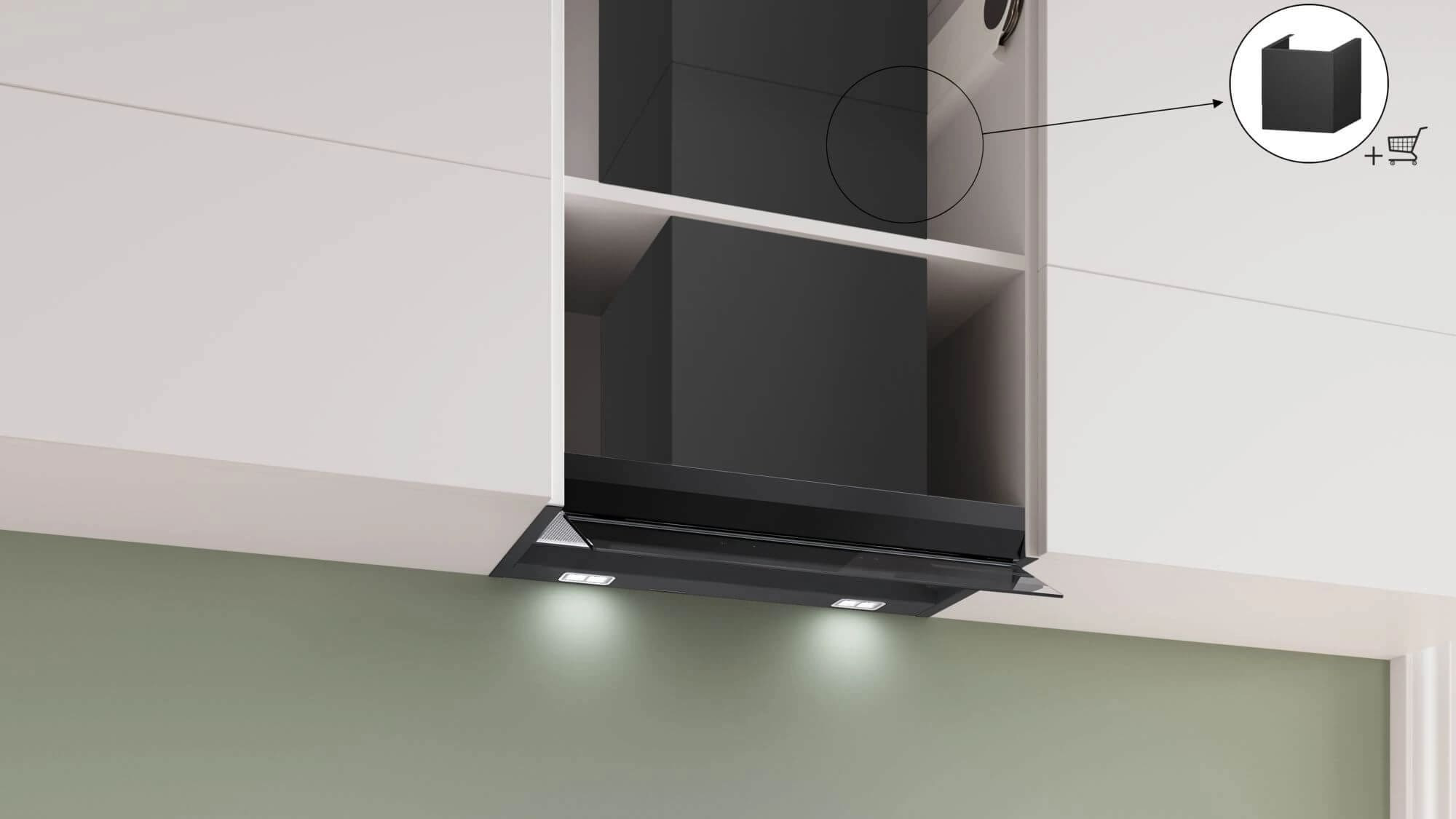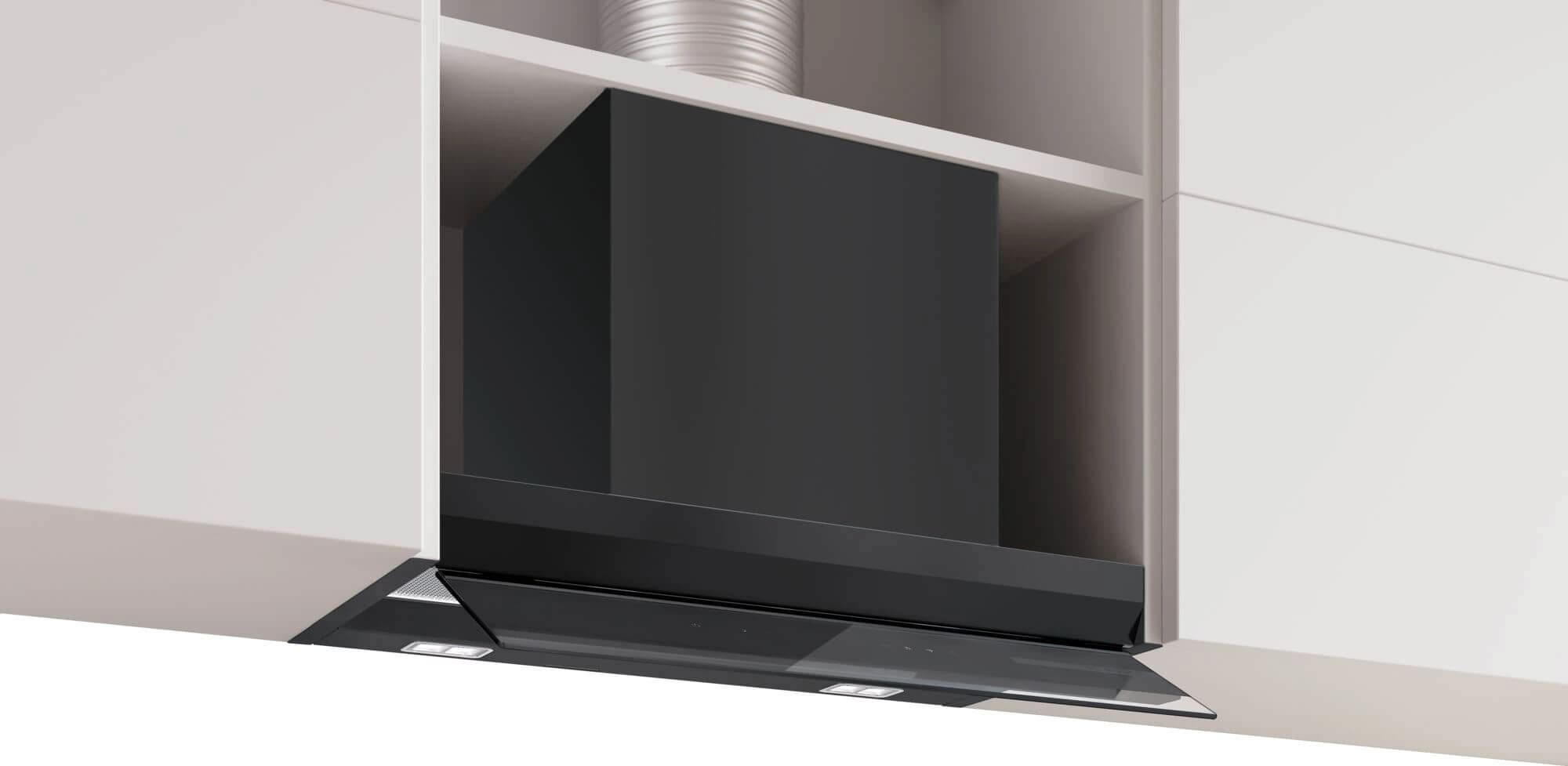 DBB67DP60 е “кубче” аспиратор за вграден монтаж, така че външно виждате елегантен панел, а основната част остава в шкафа. Отличителен плюс е Т-образният дизайн, който позволява да използвате пространството в шкафа по-умно – удобно за кухненски принадлежности (според конструкцията и допустимото натоварване на шкафа).