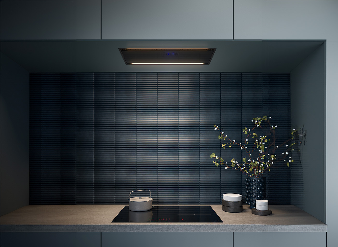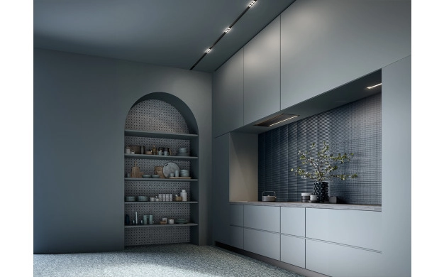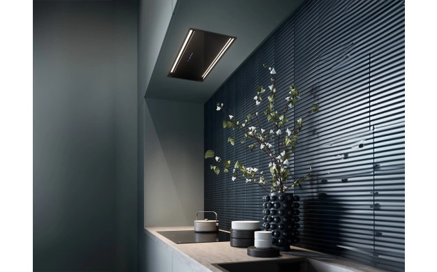 Parallel Bk е част от Design колекцията на Falmec – серия с фокус върху минималистичната естетика и качествените материали. Повърхностите от боядисана черна стомана и закалено черно стъкло поддържат изчистена линия и се комбинират с черни уреди, тъмни кухни и иноксови акценти. Вграждането в шкафовете запазва визуалния ред и оставя на преден план плота и работната зона.