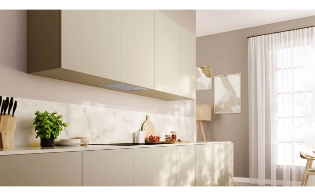 • Благодарение на незабележимия дизайн аспираторът се превръща в истинско скрито бижу. Безупречно вграденият аспиратор е практически невидим, незабележим в кухненския шкаф. Той се монтира в една равнина с шкафа, запазвайки кухнята ви елегантна и без излишно претрупване.