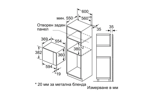 • Размери на нишата (В x Ш x Д): 560 мм – 568 мм x 380 мм – 382 мм x 550 мм