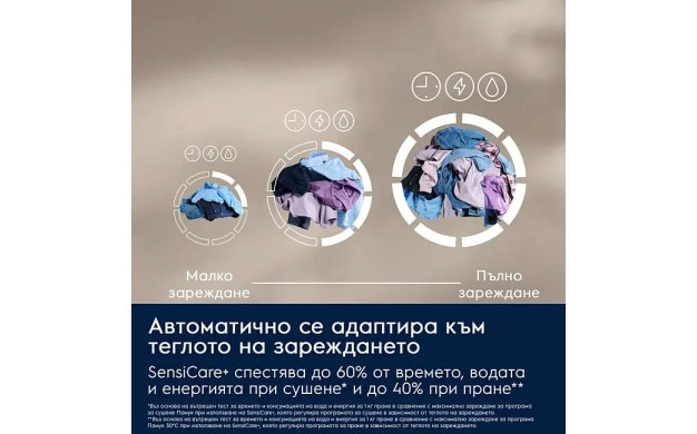 SensiCare+ засича натоварването и автоматично регулира програмите, спестявайки до 60% време, вода и енергия при сушене и до 40% при пране.