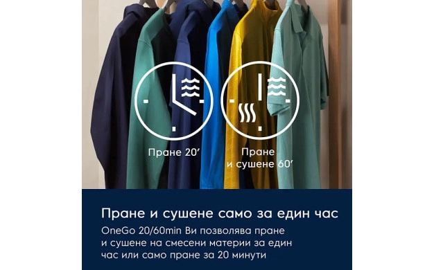 • OneGo 20/60 мин – изпира и изсушава малки товари за 1 час или само изпира за 20 минути.