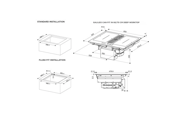 Galileo Smart разполага с 4 индукционни зони. Функцията Flexi Zone 2 позволява две зони да бъдат обединени и активирани едновременно, за да се създаде по-голяма повърхност за готвене – удобно при големи съдове, рибни тави или широки тигани.
