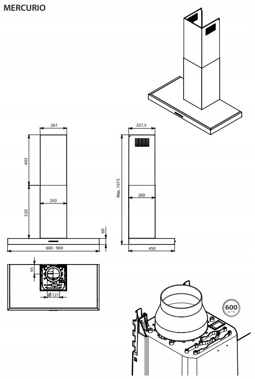 MERCURIO EVO 90 BK се монтира на стена над плота. Може да работи: