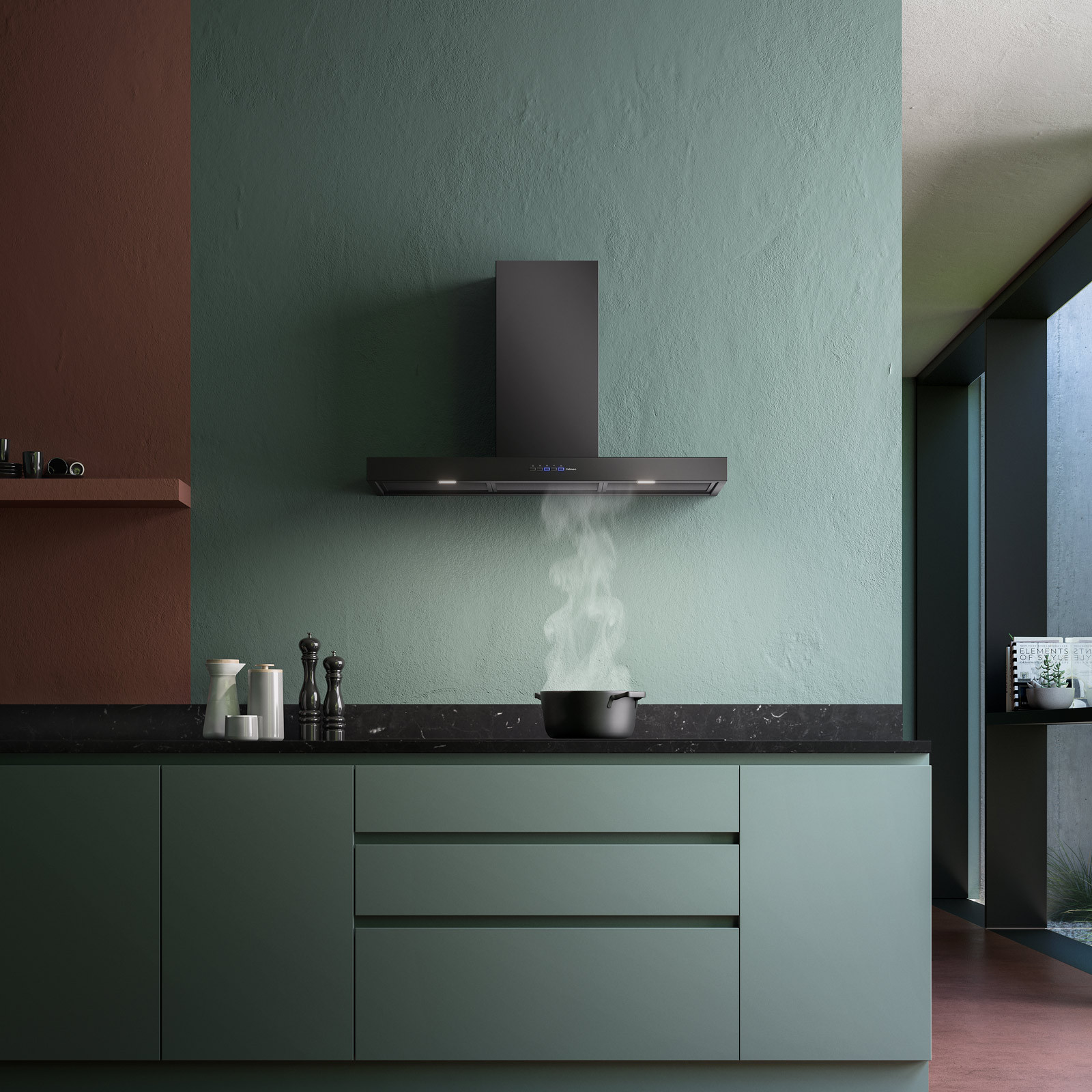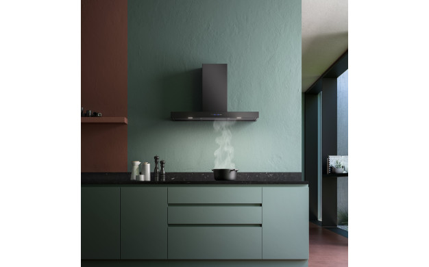 FALMEC MERCURIO EVO 90 BK е премиум стенен аспиратор с ширина 90 см, проектиран за по-големи кухни и за плотове с широчина 80-90 см. С матово черно покритие, инокс акценти, висок въздушен дебит и Dynamic LED Light, този модел комбинира силна аспирация, нисък шум и първокласен дизайн.