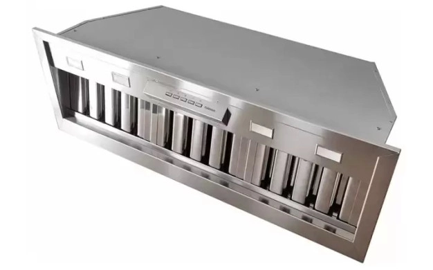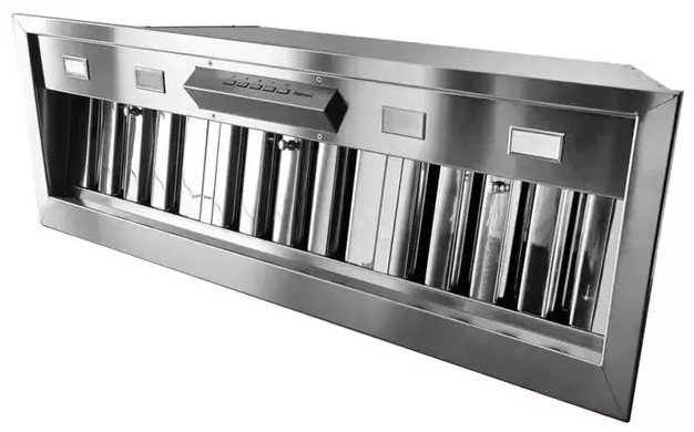 • Професионални Baffle филтри (3× 250×175 мм) — U-образни прегради улавят мазнините; наклонът отвежда мазнината към долния канал и предотвратява капене върху храната.