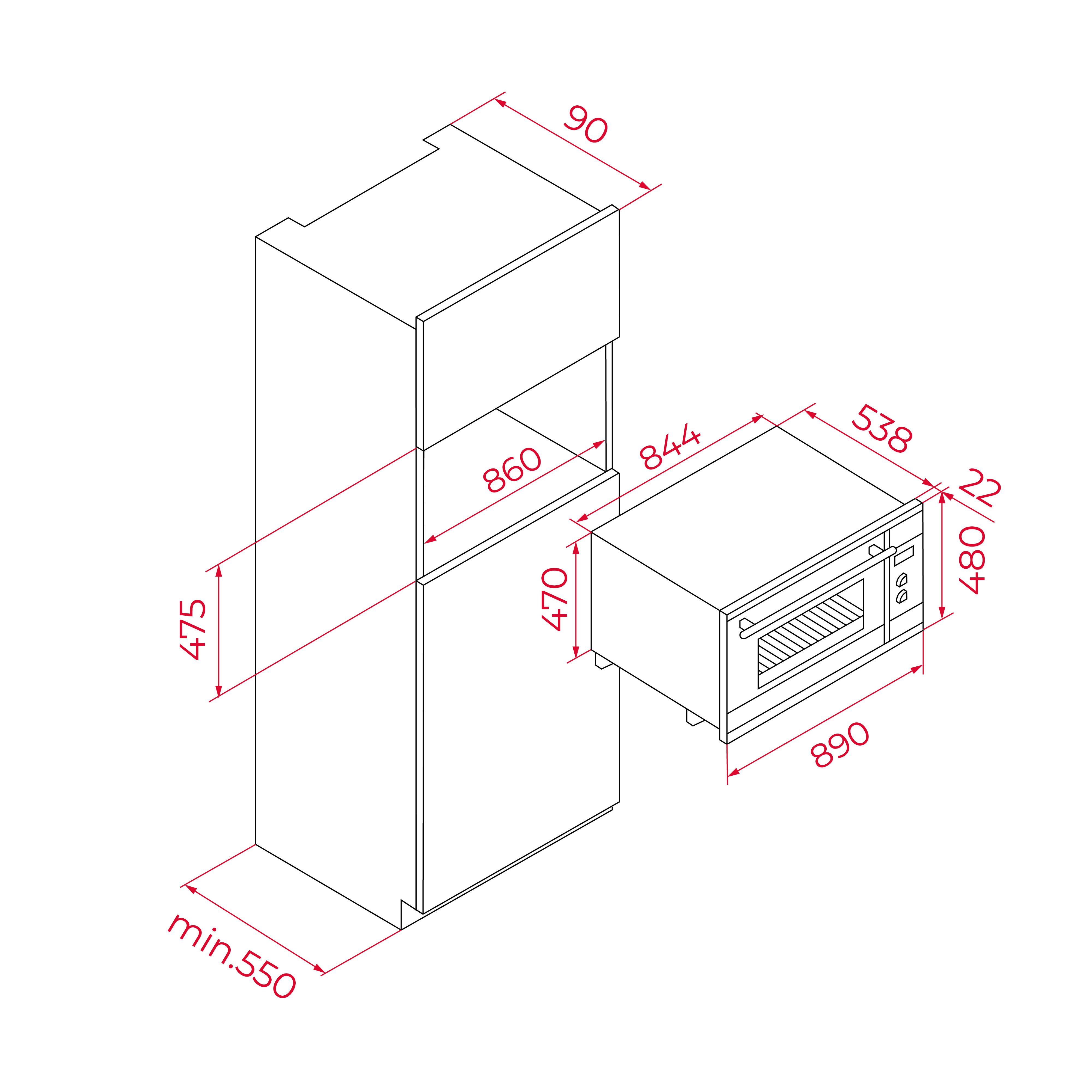 Размери (Ш × В × Д) 890 × 480 × (538 + 22) mm
