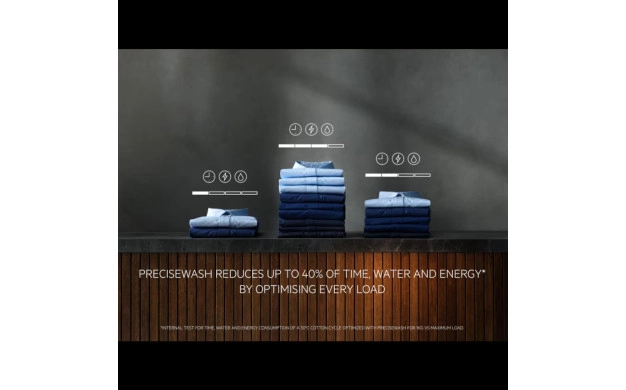• PreciseWash – автоматично адаптира ресурси според теглото, пести до 40% вода и енергия.