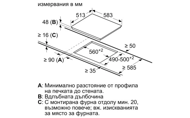 • Необходим размер на нишата за монтаж (ВxШxД mm) : 48 x 560 x (490 – 500)