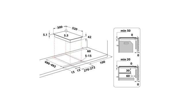 Размери за вграждане (мин.) Височина ниша: мин. 40 мм; Ширина: 270 мм; Дълбочина: 490 мм