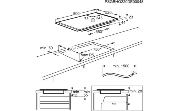 • Размери за вграждане мм (ВхШхД): 44x750x490
