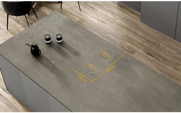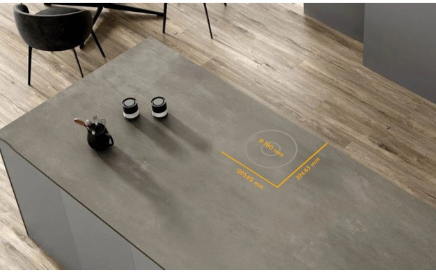 Invisacook е проектиран да работи най-успешно с голямоформатен порцелан / синтерован камък (ultra-compact surface). По спецификация за 220V конфигурации се работи в диапазона 12–20 mm. За най-добър контакт и най-стабилна работа е силно препоръчително плота да бъде 12 mm – така индукционната връзка към съда е най-ефективна (по-бърза реакция и по-малък риск от „загуба на контакт“ при позициониране).