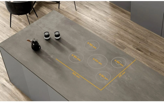 4 зони (220V) Основна семейна кухня, активно готвене, по-голям остров Четири индукционни точки под плота; Power Boost; препоръчително 12 mm порцелан (допустимо 12–20 mm)