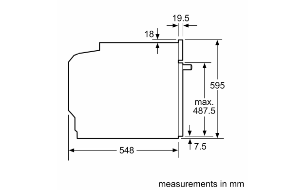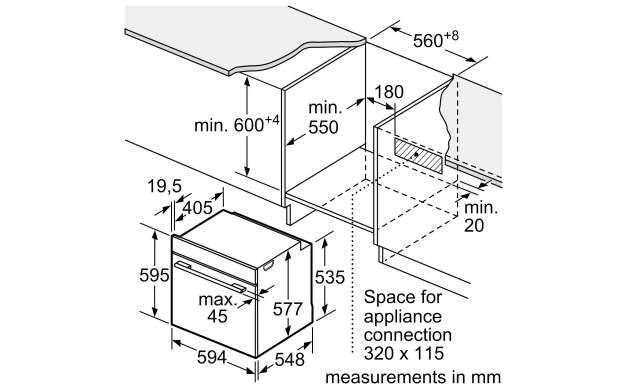 • Размери на нишата (В x Ш x Д): 560 мм – 568 мм x 585 мм – 595 мм x 550 мм