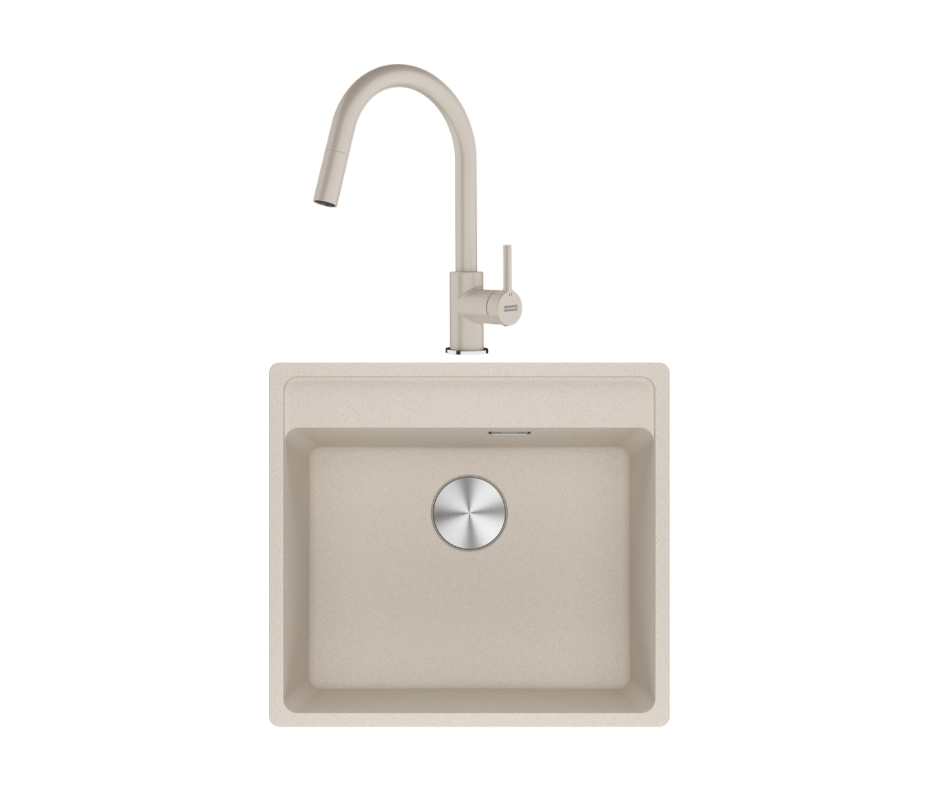 Този премиум комплект от Franke е създаден за кухни с топъл, уютен и модерен интериор. Комбинацията от гранитна мивка в цвят Sahara и смесител със същия нюанс създава изключително хармонична визия и завършено дизайнерско решение.