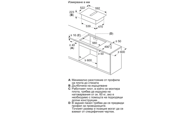 • Необходим размер на нишата за монтаж (ВxШxД mm) : 223 x 560 x (490 - 490)