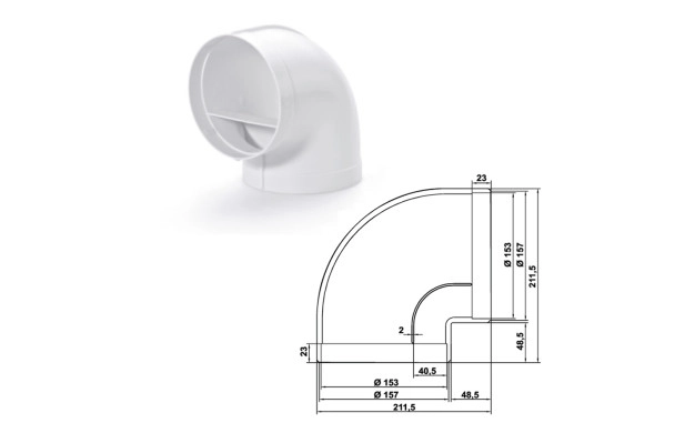 • Ниски загуби от извивката, благодарение на вградено насочващо крило.За свързване с кръгли тръби от двете страни.