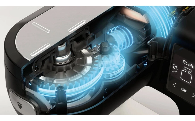 • Интегрирана везна: Показва стъпки от 1 g, измерва допълнително ml, ml мляко, ml масло, g, oz и lbs, оптимизирана за претегляне отгоре или просто директно в купата или аксесоарите.