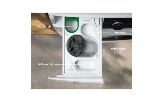 • Уникалното чекмедже UniversalDose® е оптимизирано за всички препарати и осигурява 60% по-бързо разтваряне на PODS®.* Чекмеджето за препарати се отваря и разглобява лесно, а вихровото движение на водата улеснява поддържането му чисто. Перилният препарат остава в чекмеджето, докато цикълът започне, намалявайки остатъците от препарат.