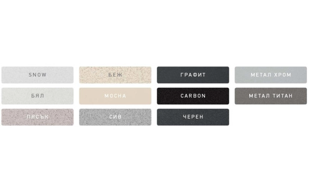 • * Разнообразие от цветове - възможност да изберете подходящия за дизайна на вашата кухня. Класически цветове, близки до естествен гранит, меки нюанси за по- умерен резултат или цветове с метален отблясък, които да обновят изцяло пространството на вашата кухня: