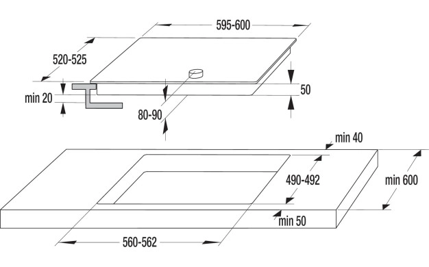 • Размери на отвора за вграждане: 56 × 7 × 49 см