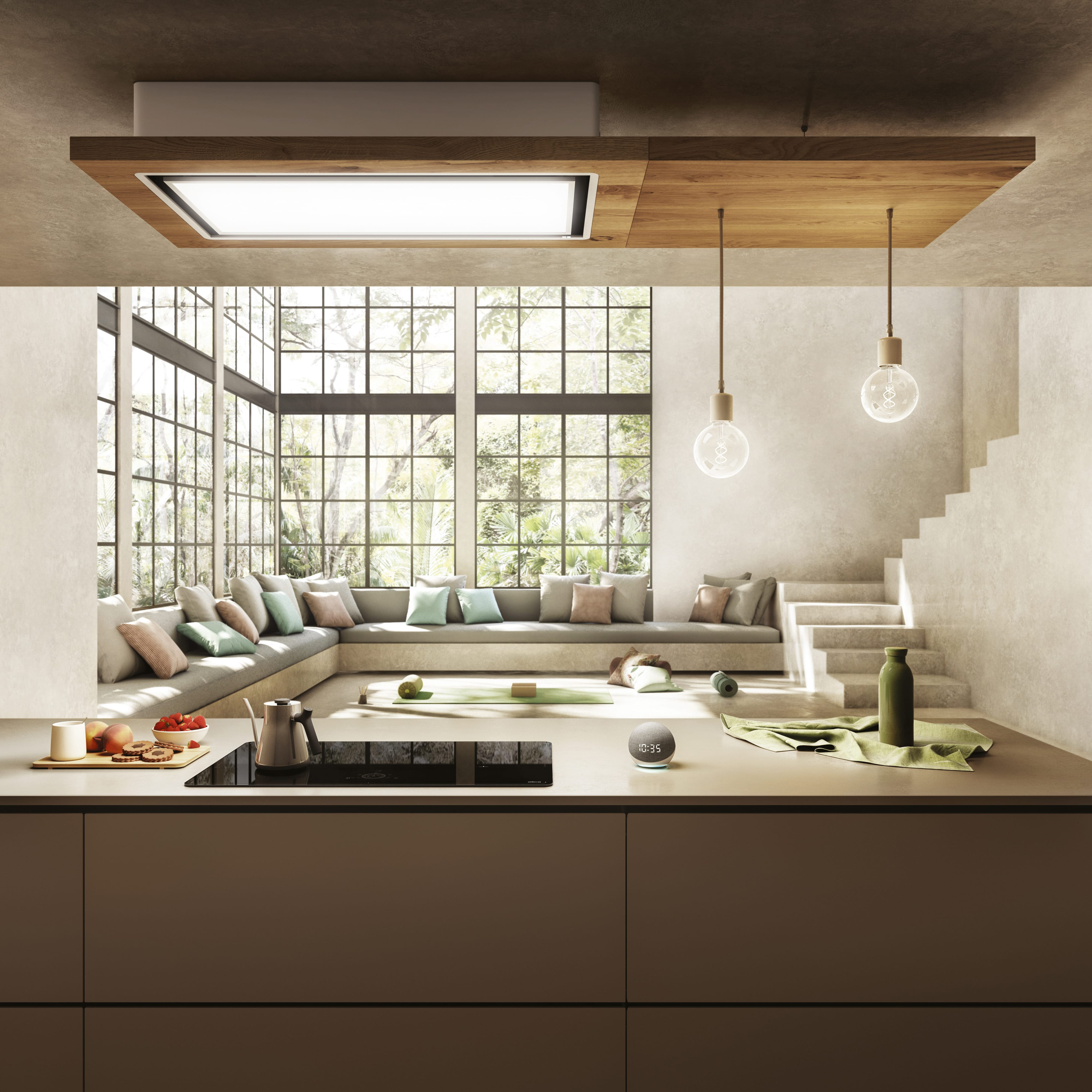 Точно тук Elica Lullaby 120 се отличава най-силно от класическите таванни аспиратори – той не просто се скрива, а активно участва в дизайна на помещението.