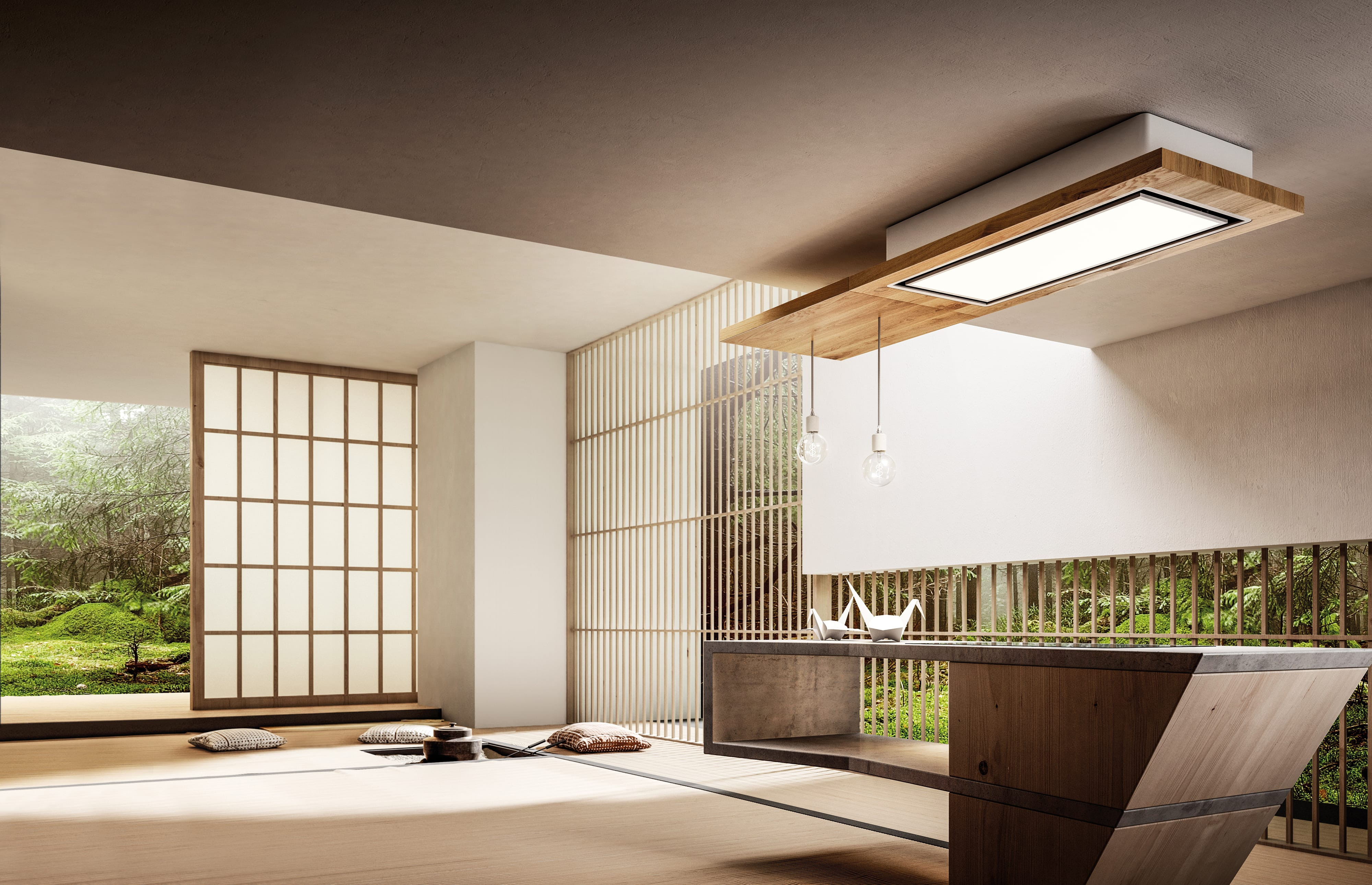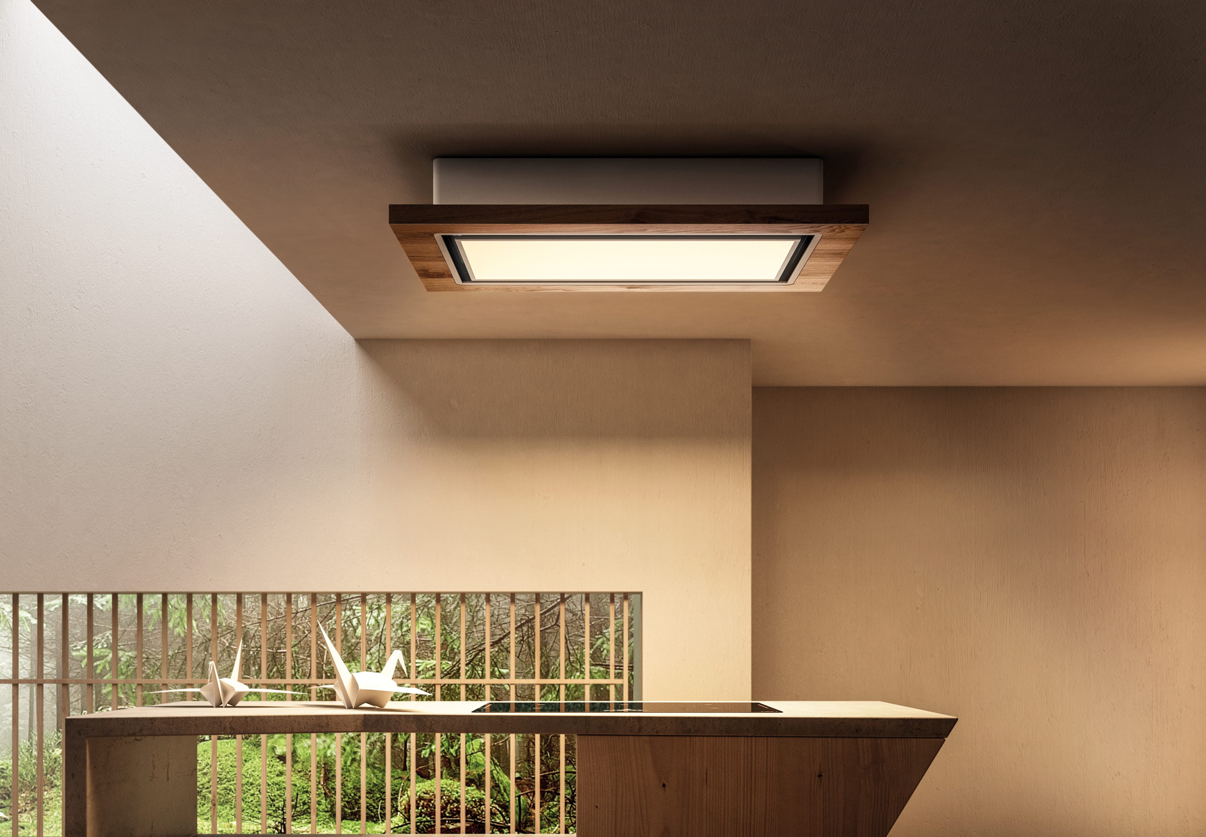 Elica Lullaby 120 е премиумен таванен аспиратор за кухня, създаден за интериори, в които техниката трябва да бъде едновременно функционална и визуално впечатляваща. Това не е просто уред за пречистване на въздуха, а истински архитектурен елемент, който се вписва елегантно в тавана и се превръща в светлинен акцент в помещението. Моделът е дело на дизайнера Fabrizio Crisà и впечатлява с изчистена линия, естествени материали, регулируемо LED осветление и интелигентни функции за управление.