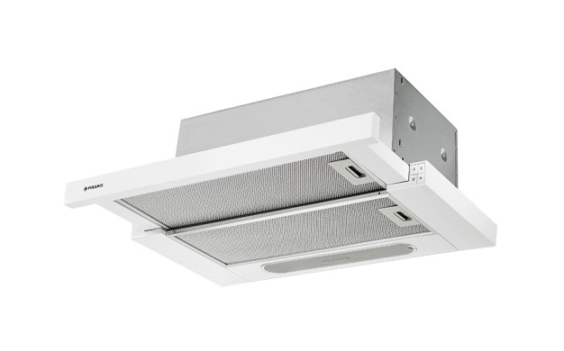 PYRAMIS TURBO Бял е телескопичен аспиратор с плъзгащ механизъм и корпус от неръждаема стомана, предназначен за вграждане в кухненски шкаф. Създаден да осигури ефективно извличане на изпарения, този модел е идеален за модерни кухни с ограничено пространство и елегантен дизайн.