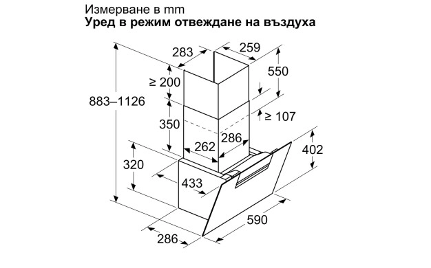 • Размери на уреда при отвеждане на въздуха (ВxШxД): 883-1126 x 590 x 433 mm