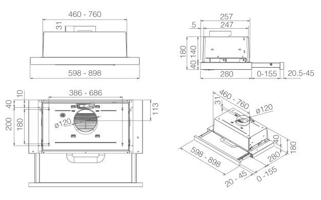 Тип на аспиратора Аспиратори за вграждане с телескопично отваряне
