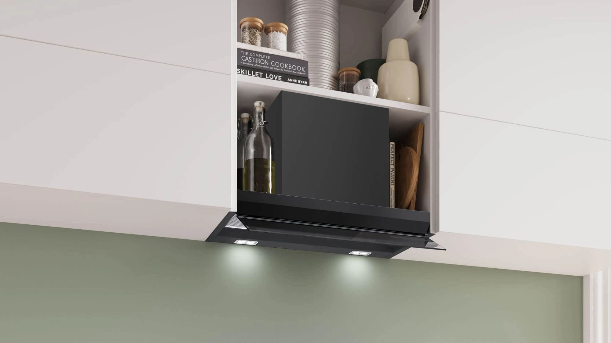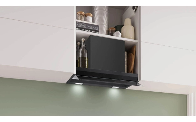 DBB67DP60 е “кубче” аспиратор за вграден монтаж, така че външно виждате елегантен панел, а основната част остава в шкафа. Отличителен плюс е Т-образният дизайн, който позволява да използвате пространството в шкафа по-умно – удобно за кухненски принадлежности (според конструкцията и допустимото натоварване на шкафа).