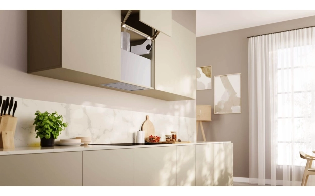 • Благодарение на незабележимия дизайн аспираторът се превръща в истинско скрито бижу. Безупречно вграденият аспиратор е практически невидим, незабележим в кухненския шкаф. Той се монтира в една равнина с шкафа, запазвайки кухнята ви елегантна и без излишно претрупване.