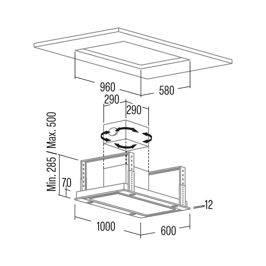 Подходящ за монтаж на таван над плота. Препоръчва се редовно почистване на металните филтри. При рециркулация е необходим активен въгленов филтър.