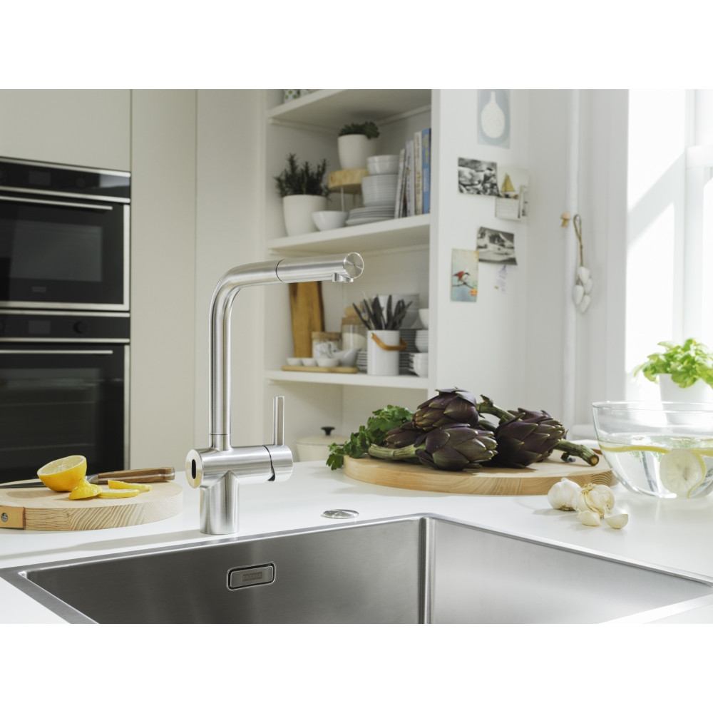 Franke Atlas Neo Nozzle Side HP SS Version – премиум инокс кухненски смесител с изтеглящ душ