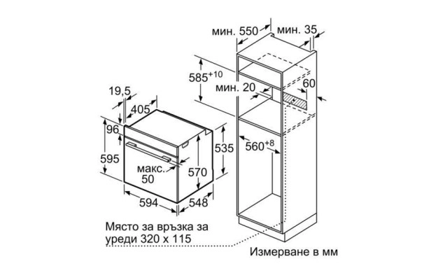 • Размери на нишата (В x Ш x Д): 560 мм – 568 мм x 585 мм – 595 мм x 550 мм