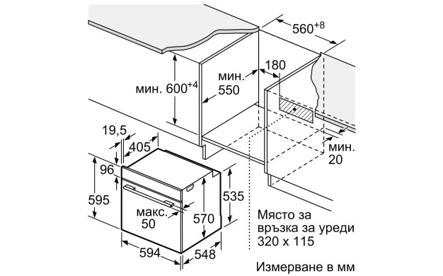 • Размери на нишата (В x Ш x Д): 585 мм – 595 мм x 560 мм – 568 мм x 550 мм