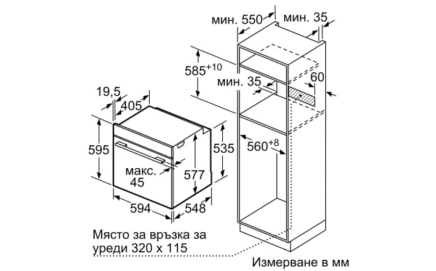 • Размери на нишата (В x Ш x Д): 560 мм – 568 мм x 585 мм – 595 мм x 550 мм
