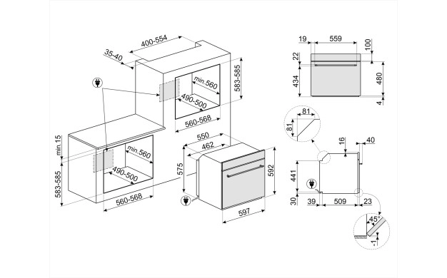 Моделът е предназначен за стандартна ниша за 60 см фурна. За точен и безопасен монтаж следвайте монтажната схема и осигурете необходимата вентилация на шкафа.