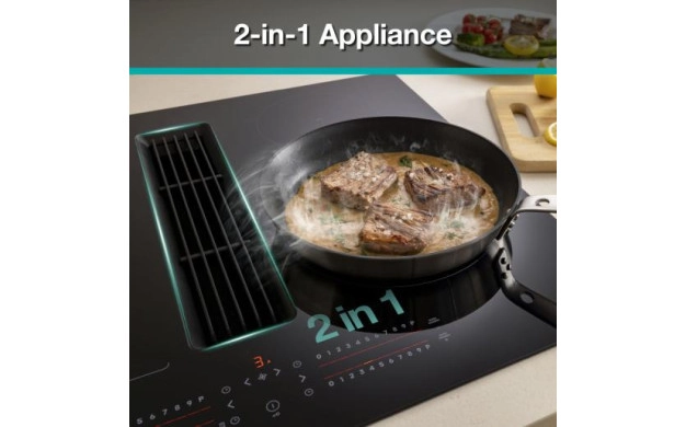 Съчетание от топ енергийна ефективност A+++, интелигентна вентилация и прецизен индукционен контрол. Моделът обединява готварски плот и абсорбатор в един елегантен уред, освобождавайки пространство и поддържайки въздуха чист по време на готвене.