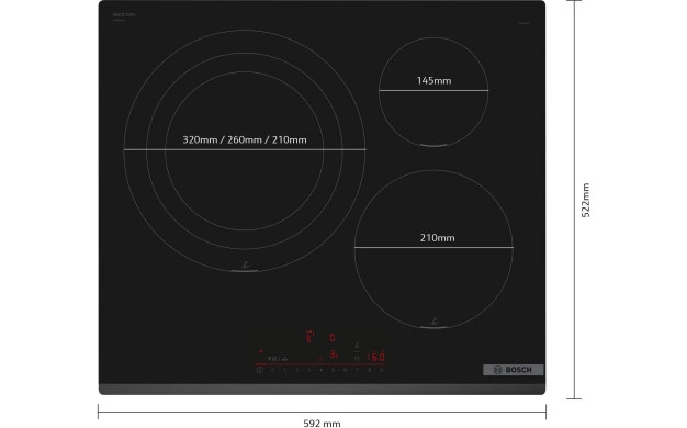 • Задна лява зона за готвене: 210 мм, 260 мм, 320 мм, 2.2 KW (макс. мощност 3.7 KW)