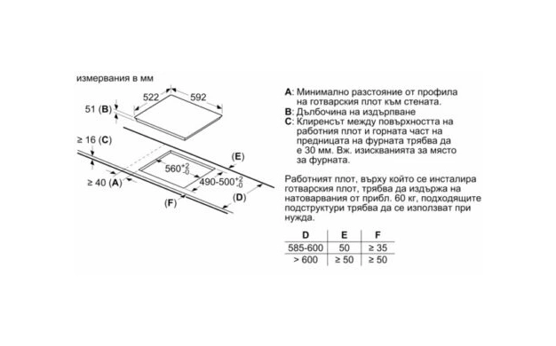 • Необходим размер на нишата за монтаж (ВxШxД mm) : 51 x 560 x (490 – 500)