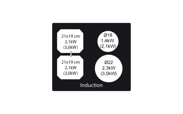 • Зони за готвене 21 x 19,1 см. – 2,1 kW (Booster 3 kW)