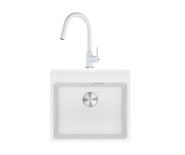 Този премиум комплект от Franke съчетава модерна визия, висока издръжливост и максимален комфорт при работа в кухнята. Комбинацията от бяла гранитна мивка и смесител с изтеглящ се душ създава изцяло завършена и хармонична кухненска зона.