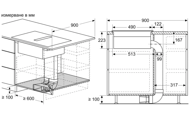 • Подходящ за конфигурация с екстракция чрез въздуховод или рециркулация (вкл. Диференцирани софтуерни режими). Необходими задължителни аксесоари за инсталиране: - HEZ9VEDU0 за монтаж с отвеждане на въздуха - HEZ9VRPD0 за рециркулация и отвеждане на въздуха през цокъла или под шкафа с филтри за миризма cleanAir. -HEZ9VRUD0 за рецуркулация без отвеждане в тръби с филтри за миризми cleanAir.