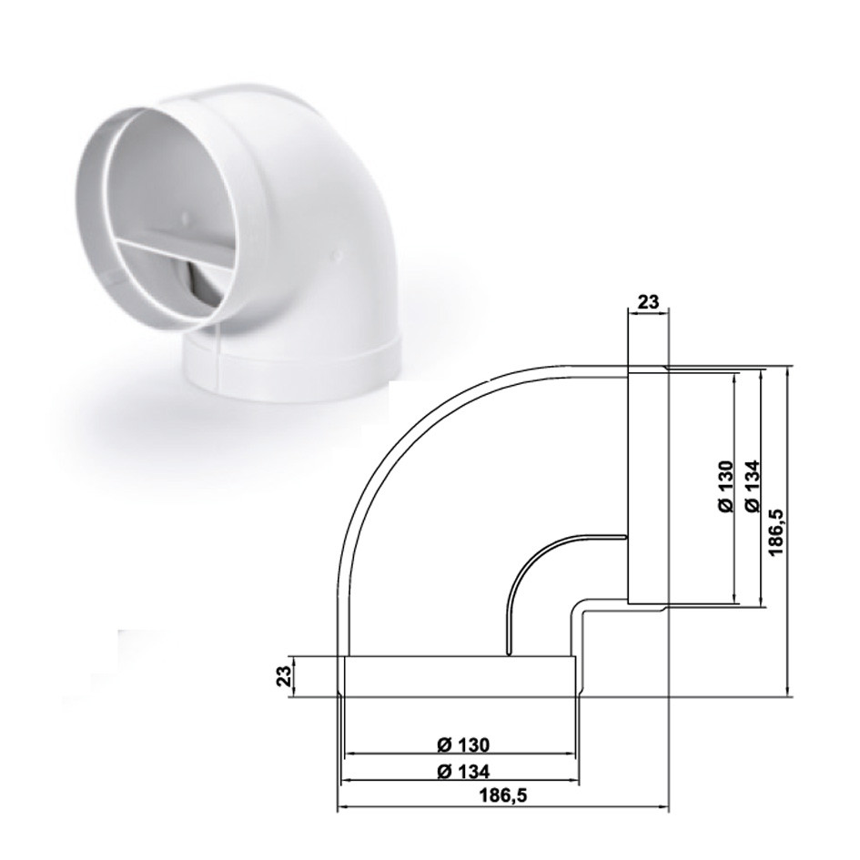 Ниски загуби от извивката, благодарение на вградено насочващо крило.За свързване с кръгли тръби от двете страни.
